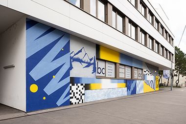 Wieder einmal geht unsere Schule einen kreativen Weg und setzt ein ebenso farbenfrohes wie lebensbejahendes Statement im manchmal allzu grauen Alltag. Der gesamte Außenbereich des Haupteinganges ist von dem deutschen Künstler Colin Linde in den Grundfarben unseres Corporate Designs verschönert worden. Und zwar in Form eines Straßen-Graffitis.