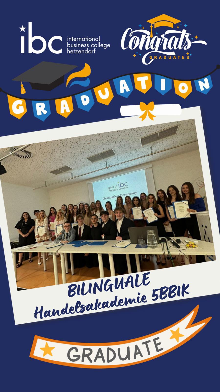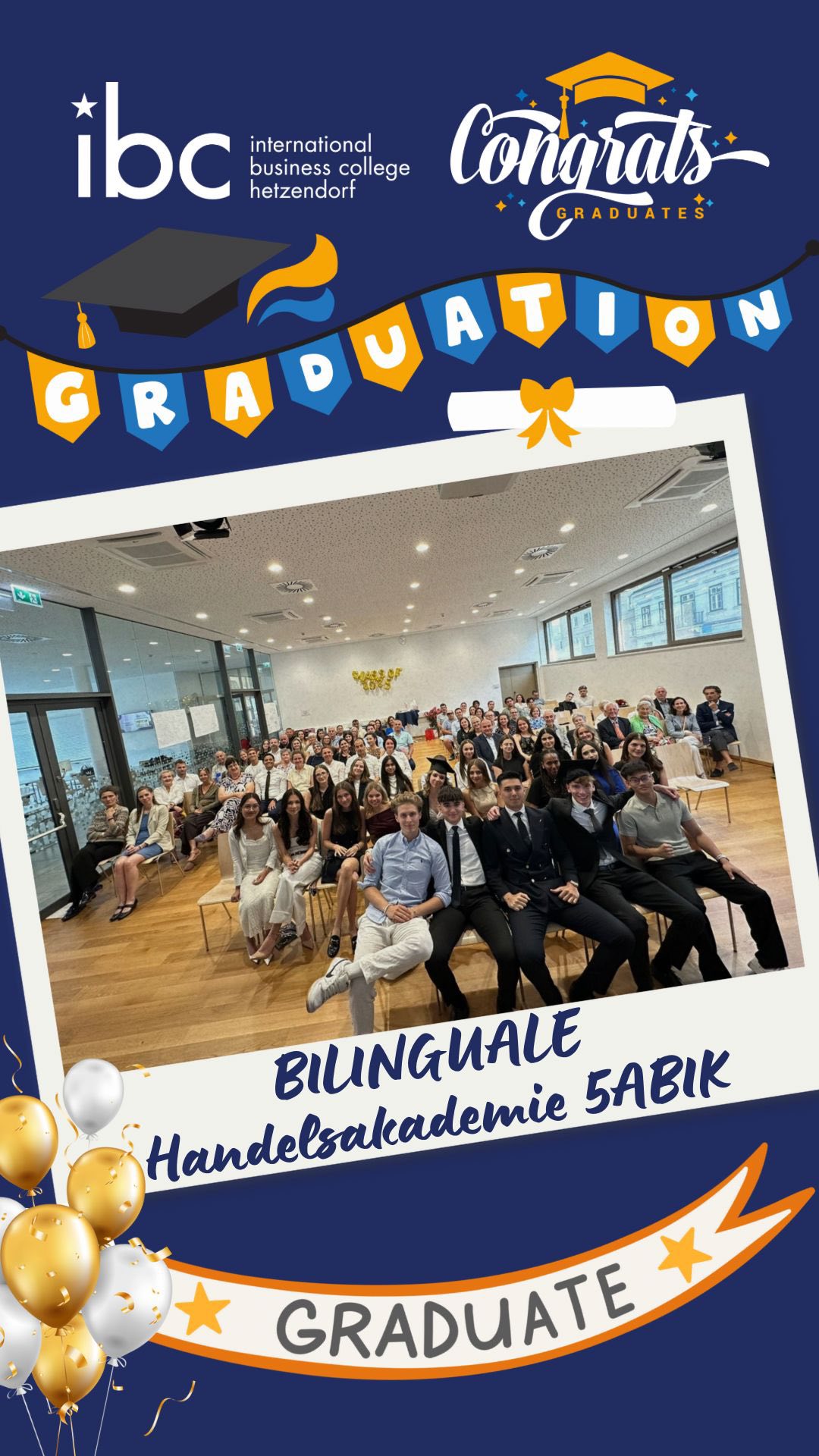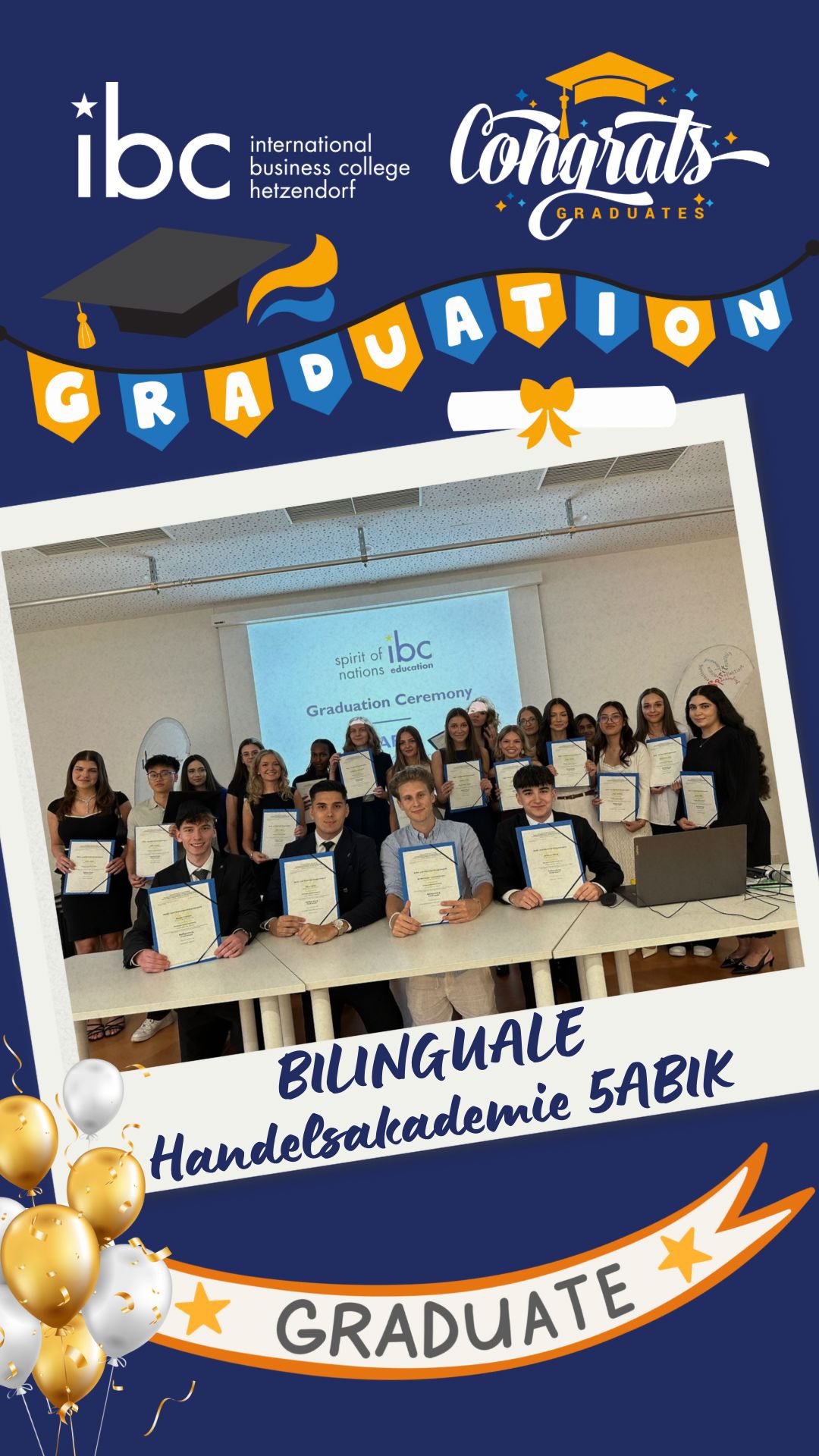 Am 18. Juni 2025 feierten wir die beeindruckenden Absolventinnen unserer Bilingualen Handelsakademie (5ABIK und 5BBIK). Diese Klassen glänzten mit herausragenden Leistungen bei der Reife- und Diplomprüfung und erzielten eine bemerkenswerte Anzahl an Ausgezeichneten Erfolgen. Der bilinguale Zweig bewies einmal mehr, wie hervorragend unsere Schülerinnen wirtschaftliches und sprachliches Know-how verbinden. Die gesamte Schule zieht den Hut vor dieser Leistung – Chapeau und alles Gute für die Zukunft!