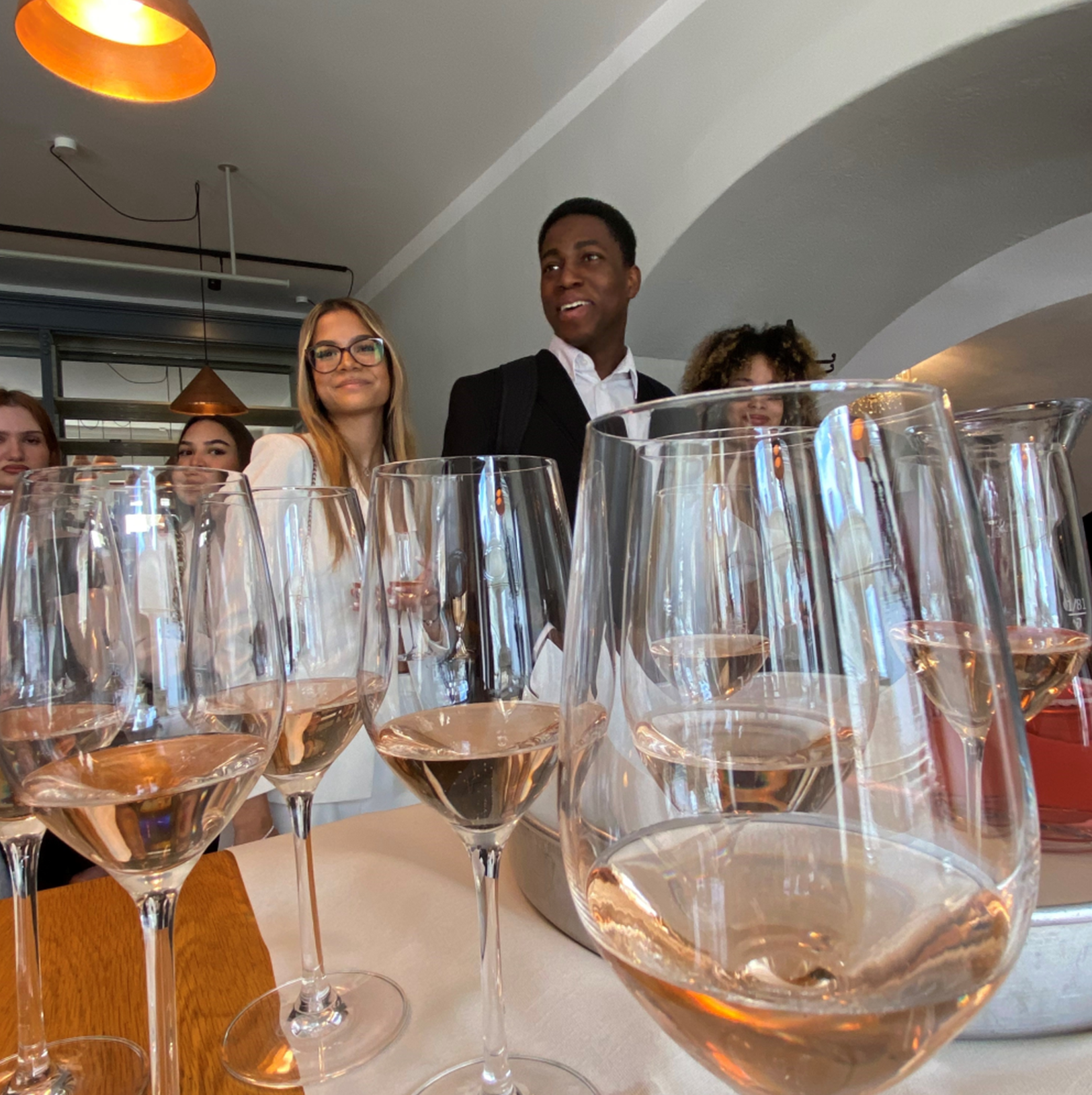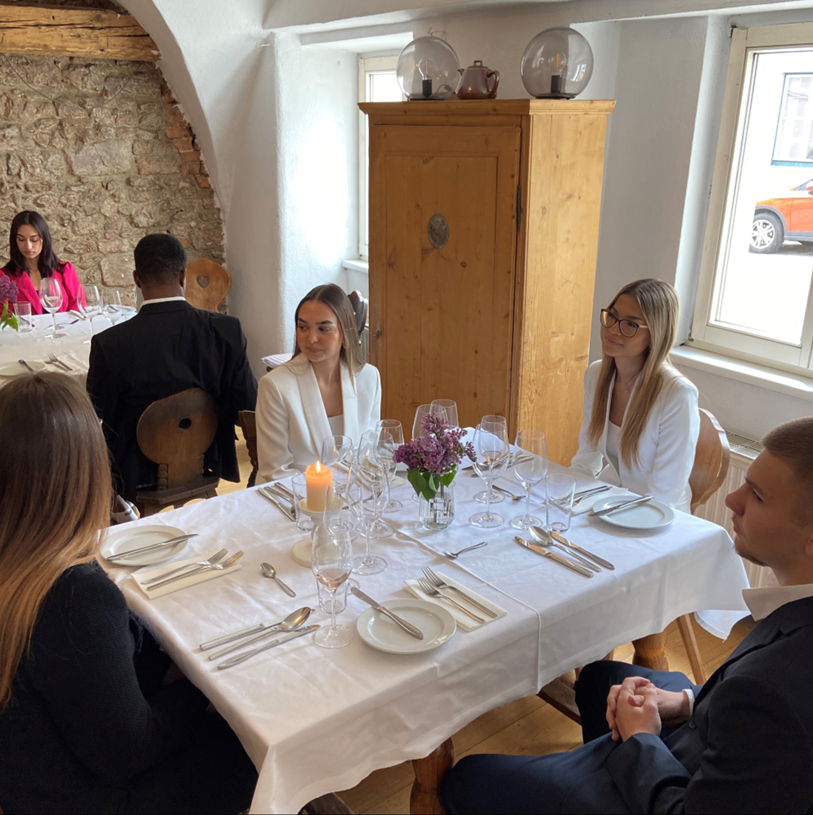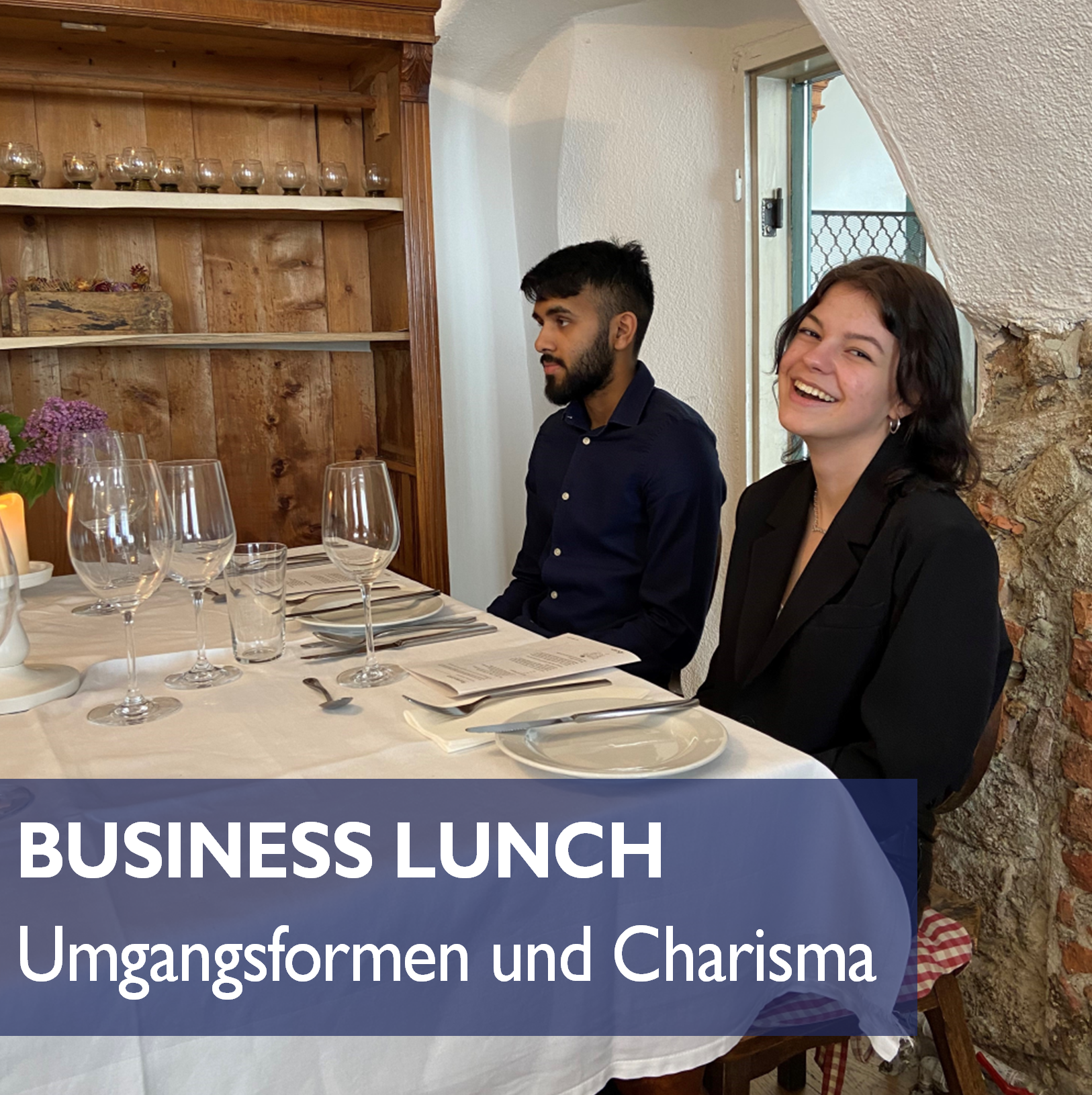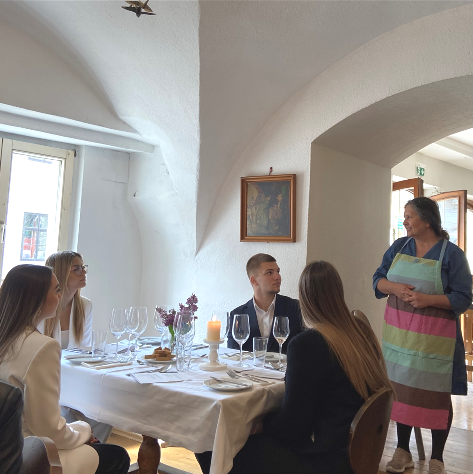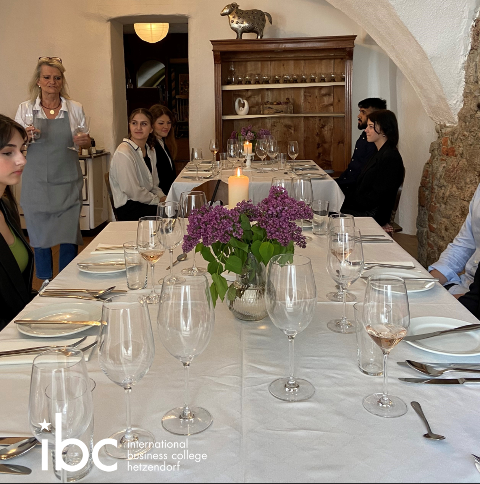 Schüler*innen der 3AS stilsicher am Business-Parkett bei der Heurigenwirtin Johanna Gebeshuber als Gastgeberin.