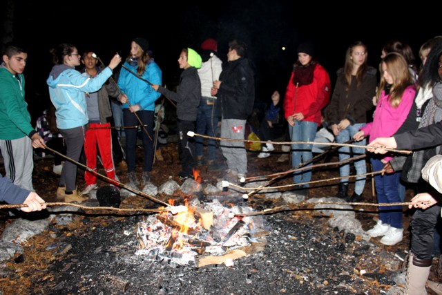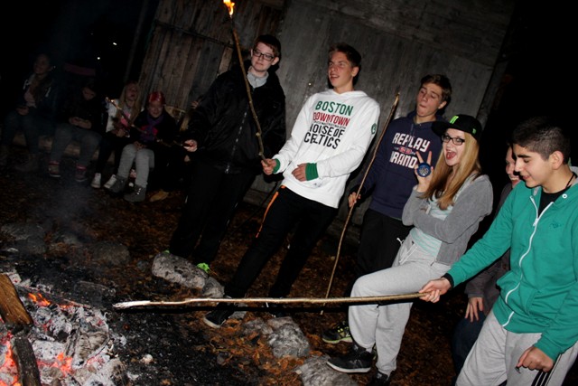 Das am letzten Abend arrangierte Lagerfeuer brachte den beiden Klassen noch einmal die Möglichkeit sich gegenseitig auszutauschen und miteinander zu plaudern. Da man mit etwas essen viel leichter Kontakt zu neuen Gesichtern aufnehmen kann, haben sich die Schüler und Schülerinnen die Mühe gemacht Marshmallows zu besorgen, die beim Lagerfeuer sofort gegrillt und natürlich auch mit viel Genuss verspeist wurden.