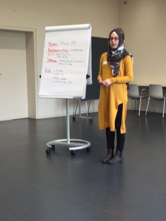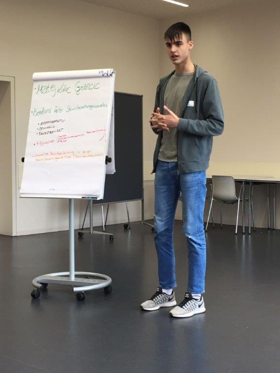 Den Abschluss bildete eine Selbstpräsentation, die wir zunächst auf einem Flipchart vorbereiteten und danach vor der Gruppe hielten. Wir erhielten von den Gruppenleitern ein ausführliches Feedback, sowohl zu den Inhalten als auch zum Präsentationsverhalten