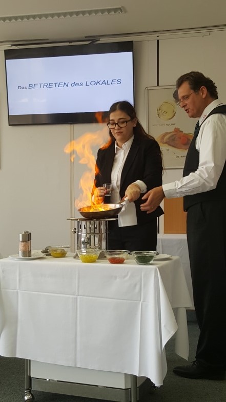 Dann konnten wir uns hinsetzen und mit dem Essen beginnen. Als Erstes bekamen wir einen Gruß aus der Küche, gekochten Spargel mit Soße. Zwei Schülerinnen der 2BS durften sogar beim Flambieren der Garnelen für die Vorspeise helfen. Danach folgten die Rindssuppe und die Hauptspeise. Das Highlight des Tages war das Dessert. Während des Essens hielt Herr Prof. Koch eine Präsentation über das richtige Benehmen im Restaurant.