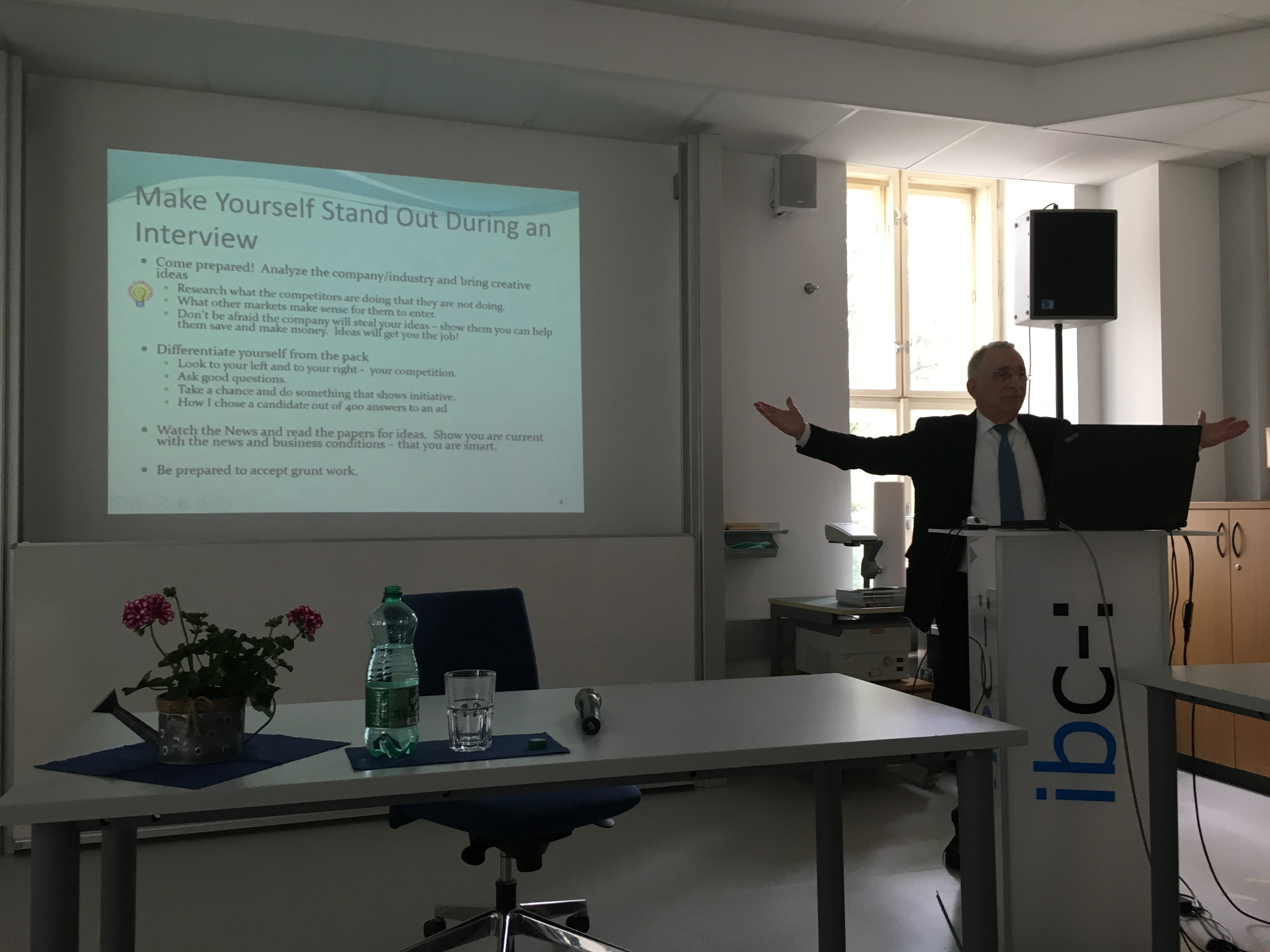 Er begann mit einer kreativ designten Präsentation über Entrepreneurship. Der Entrepreneur erklärte die Anfänge seiner Business-Karriere und forderte mehrmals dazu auf, Fragen zu stellen. Mr Chuck Perl erzählte nicht nur über seine Laufbahn, sondern gab Geheimtipps, wie Schüler dieses Wissen für sich selbst nutzbar machen können. Nachdem er über Entrepreneurship vortrug, kam „How to find a good job“ an die Reihe. Der Vortragende erklärte, wie man in „schwierigen Zeiten“ einen guten Beruf findet. Mehrmals betonte er die Bedeutung von „Networking, Networking and Networking“. Er wies darauf hin, dass sich alle Schüler Visitenkarten zulegen sollten und gab hierzu auch einzigartige Geheimtipps.